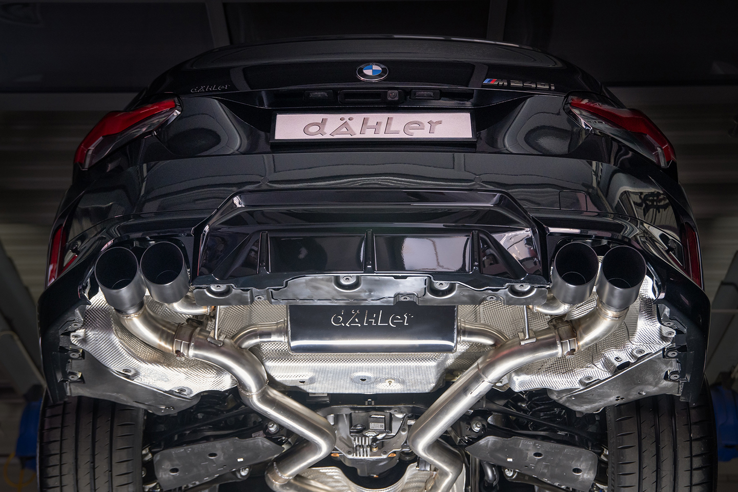 Quad 90mm matte black dAHLer exhaust tips replace the factory finishers for a more aggressive appearance.